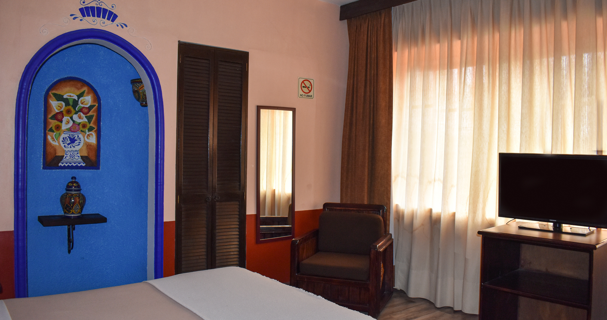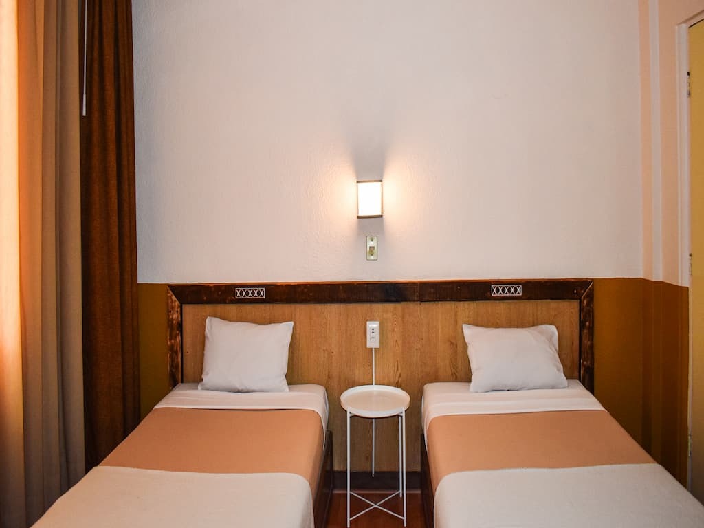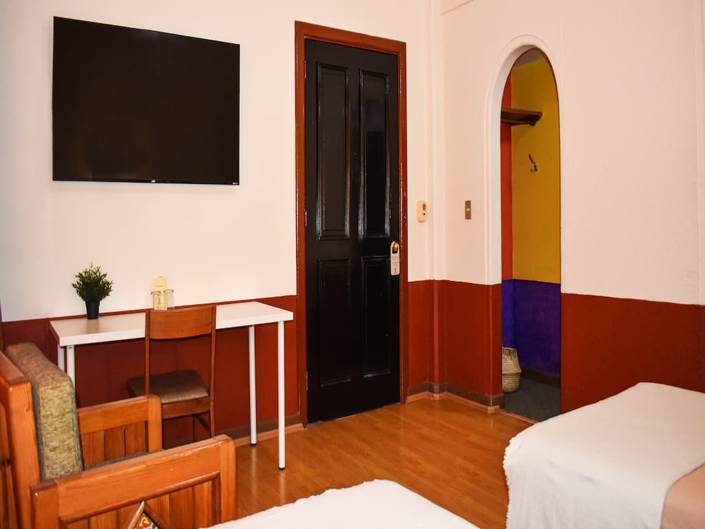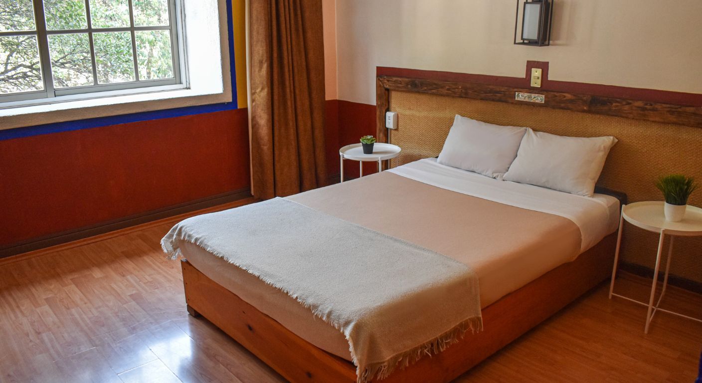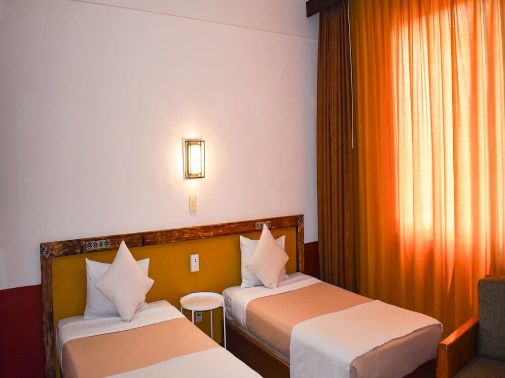 Habitación acogedora con una cama matrimonial, perfecta para parejas o viajeros individuales. Cuenta con escritorio, televisión, mesa de noche, secadora de pelo, clóset, caja de seguridad, ventilador, plancha y burro de planchar para una experiencia cómoda y práctica.