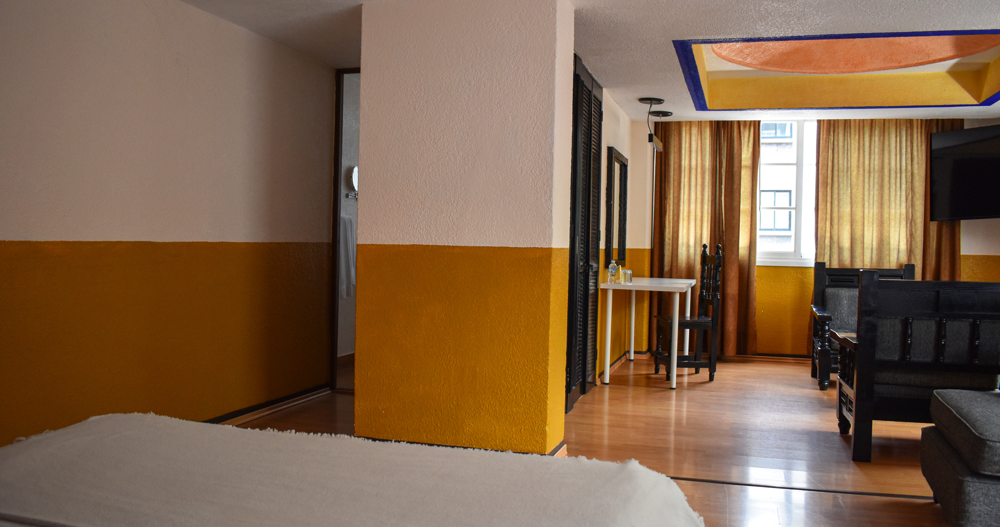 Amplia habitación con dos camas matrimoniales y una sala independiente con tres sillones individuales y un sofá. Equipada con escritorio, televisión, mesa de noche, secadora de pelo, clóset, caja de seguridad, ventilador, plancha y burro de planchar, ideal para grupos o largas estancias.